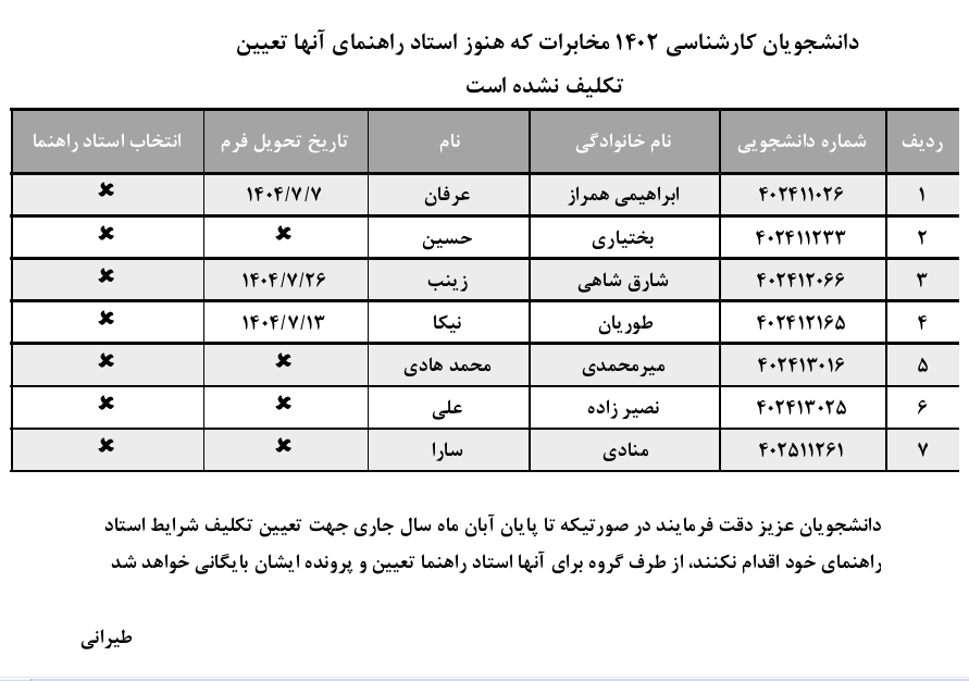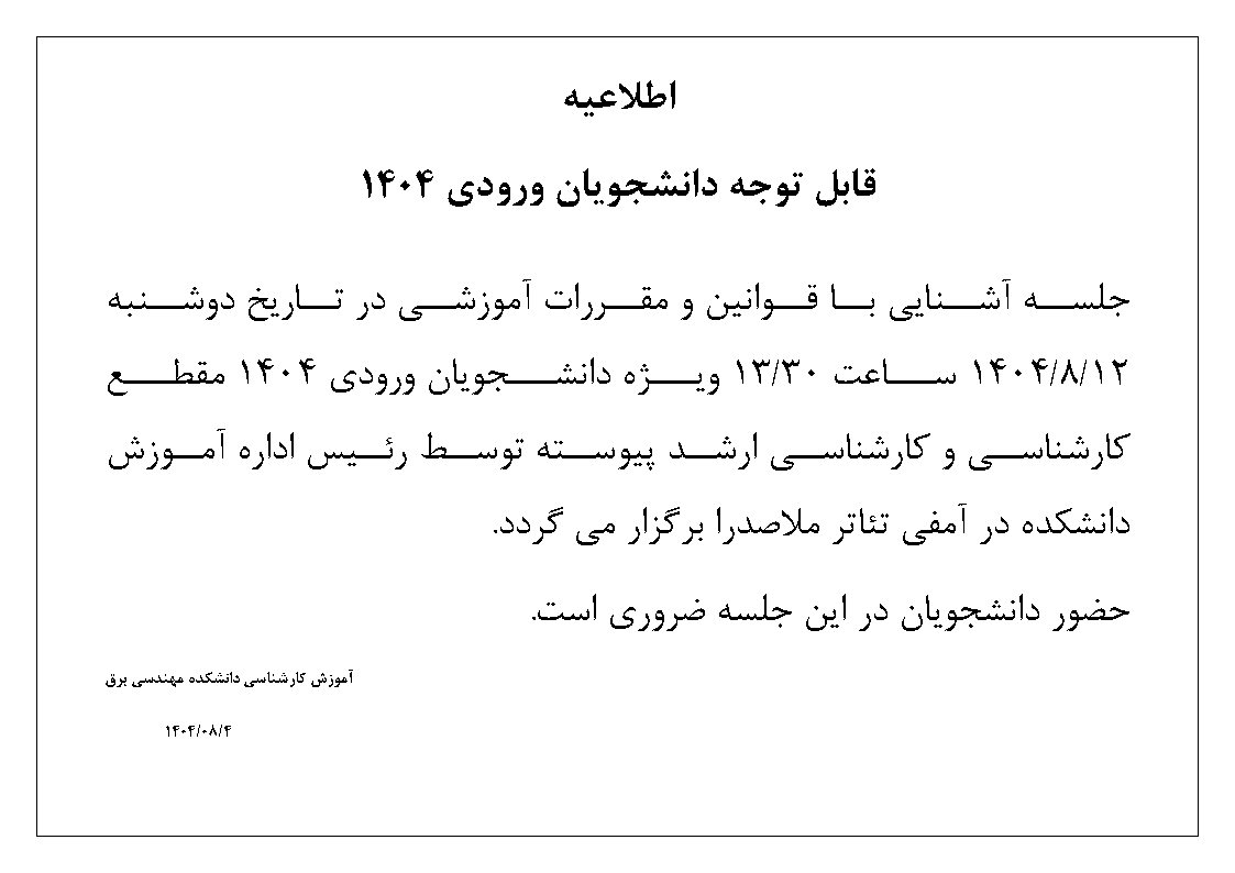 به اطلاع دانشجویان کارشناسی ارشد گروه قدرت ورودی ۱۴۰۴ می رساند، دانشجویان با مراجعه به اساتید گروه قدرت استاد راهنمای خود را حداکثر تا ۱۸ آبان ۱۴۰۴ تعیین کنند، درغیر اینصورت گروه نسبت به تعیین استاد راهنما اقدام خواهد کرد.